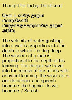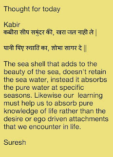 Technology can be extolled or criticized, as one may perceive it; but this technology has become my platform for sharing goodness with a diverse set of people over the last 3 months and more. I started out writing on Kabir’s Dohas late in May, and shared that on Whatsapp with a few contacts. Within a few days I added Thirukkural by Thirvalluvar. Alternating between the two, I have been posting a daily thought through Whatsapp, Facebook and Emails, to many known and some unknown people. I have borrowed the original thought from these Saints’ writings, and made a short interpretation in my own words, to suit present context or match with present times. It has been a fulfilling and enjoyable journey